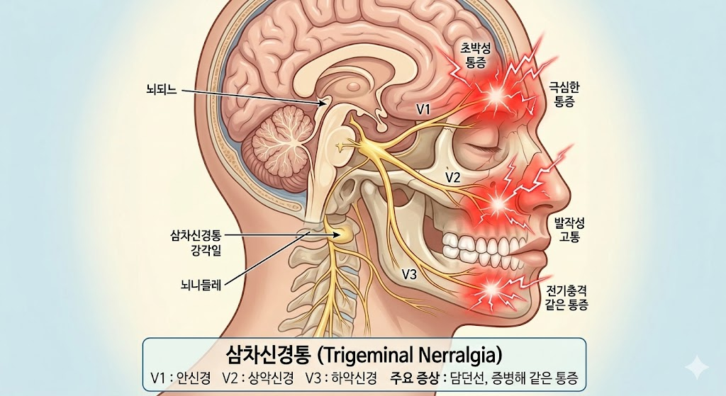 삼차신경통은 얼굴 한쪽이 번개처럼 찌릿하게 튀는 통증이 반복되는 병이에요. 양치나 세수 같은 사소한 자극에도 갑자기 통증 스위치가 켜져서, 몇 초가 몇 분처럼 느껴지곤 하죠. 서울대병원 의학정보를 보면 통증이 순간에서 수초, 길면 수분까지도 발작적으로 나타난다고 설명해요. 통증이 한 번 제대로 시작되면 그날 일정이 통째로 무너지는 경우가 많아요.